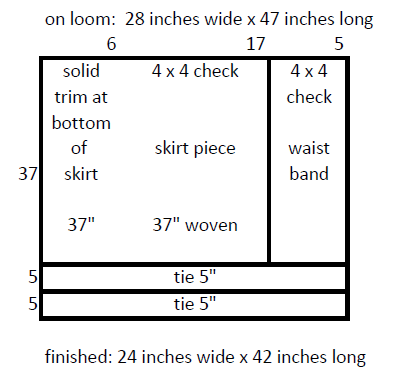 Here is an image of the layout and cutting diagram.  This then, fits a loom that is more than 28 inches wide.  For an even narrower loom, this could be woven in 23 inches to accommodate the skirt, and the waistband and ties could be woven lengthwise after the skirt.