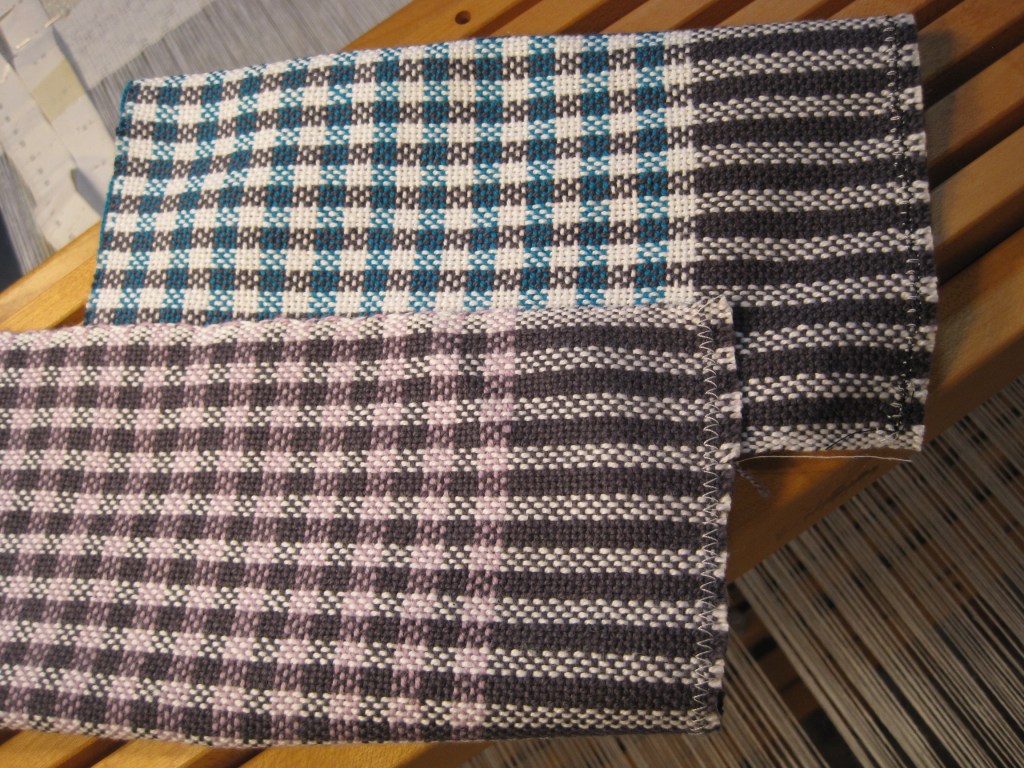 The fun of creating a more “neutral” warp is that any colour can be added in the weft.  The weft is woven in narrow 4 and 4-thread repeats resulting in gingham check for the top of the apron, and creating a bottom border in stripes. For one apron I used a turquoise and white 4 and 4 pick pattern to make the gingham check.  In the second apron I used lilac and charcoal for a more muted gingham.  Below is a close-up of the fabric samples.