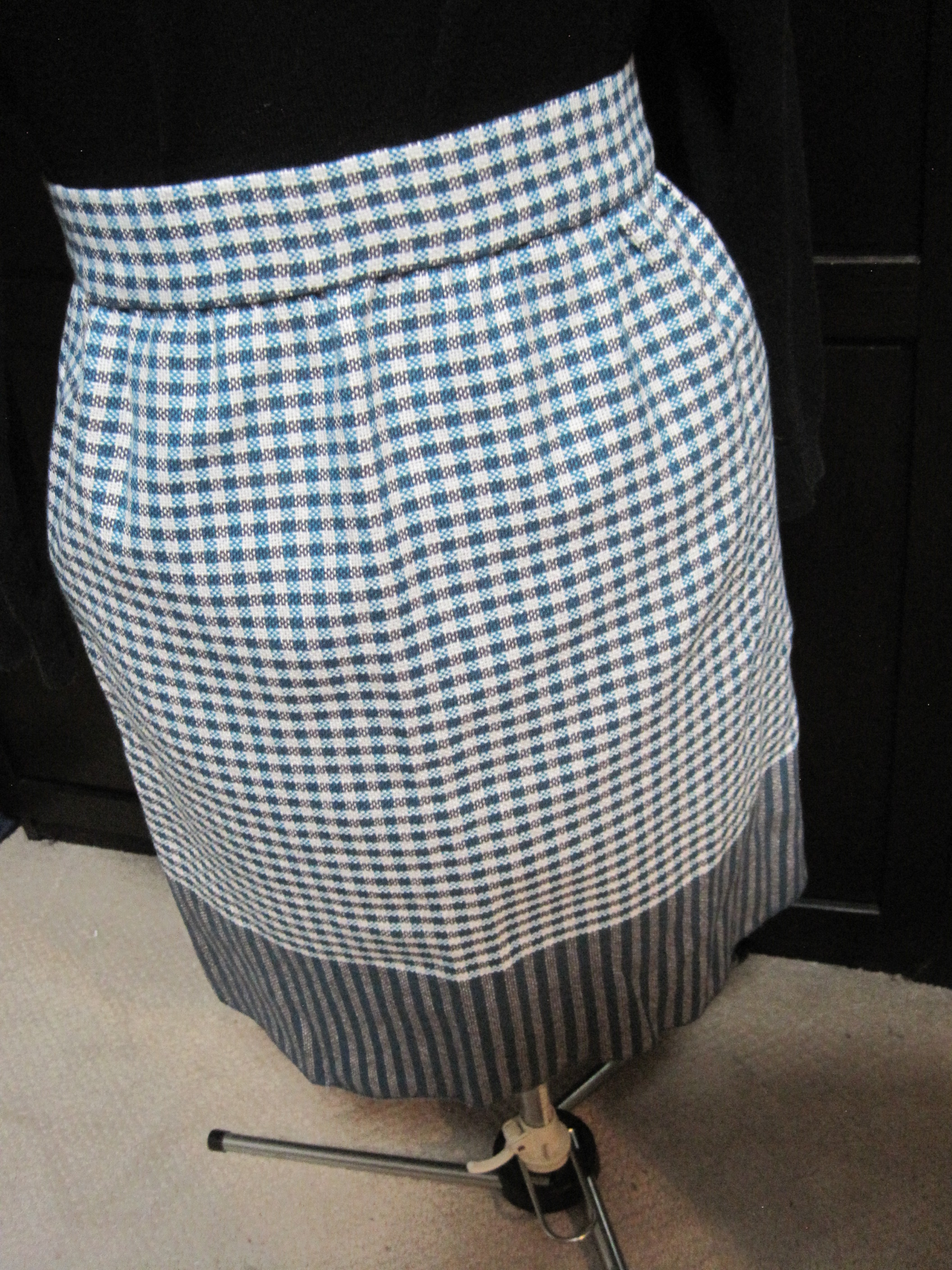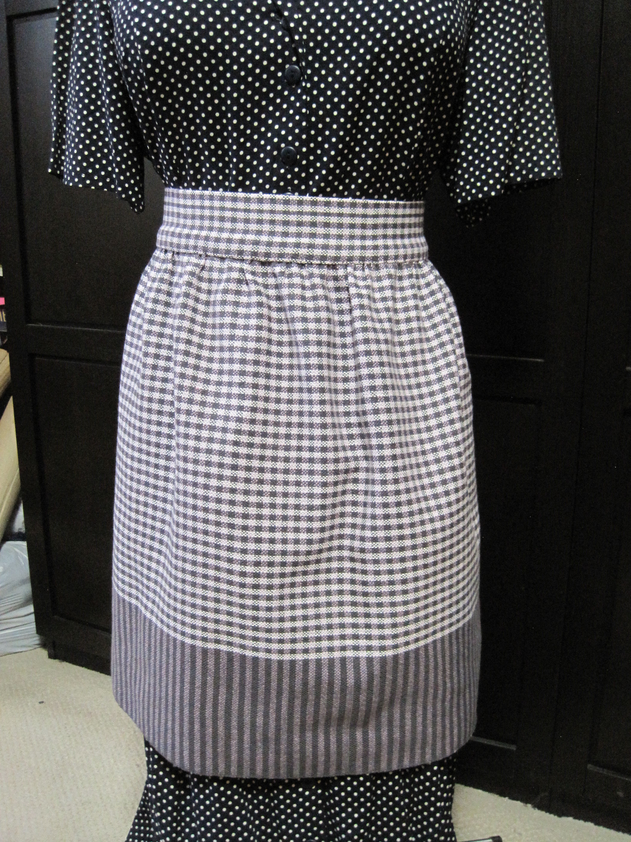 Once off the loom, the fabric was turned sideways, and the side hems on the skirt were sewn and pressed.  The waist band was cut to 25 inches long and the checked edge of the apron skirt gathered to fit the waist band.  Then the ties were stitched lengthwise to form a tube, turned right side out and attached to the ends of the waistband with right sides together.  The top of the waist band was folded down to cover all the raw edges, and stitched down, and there it is!