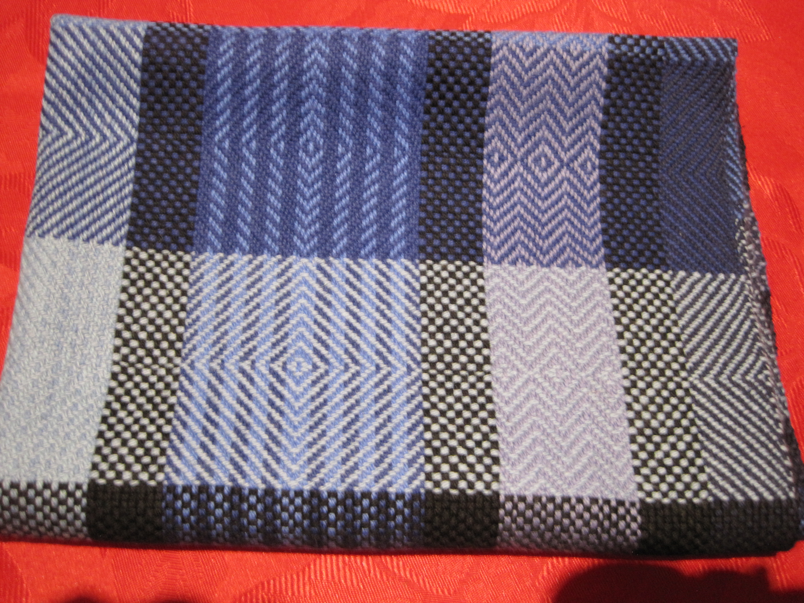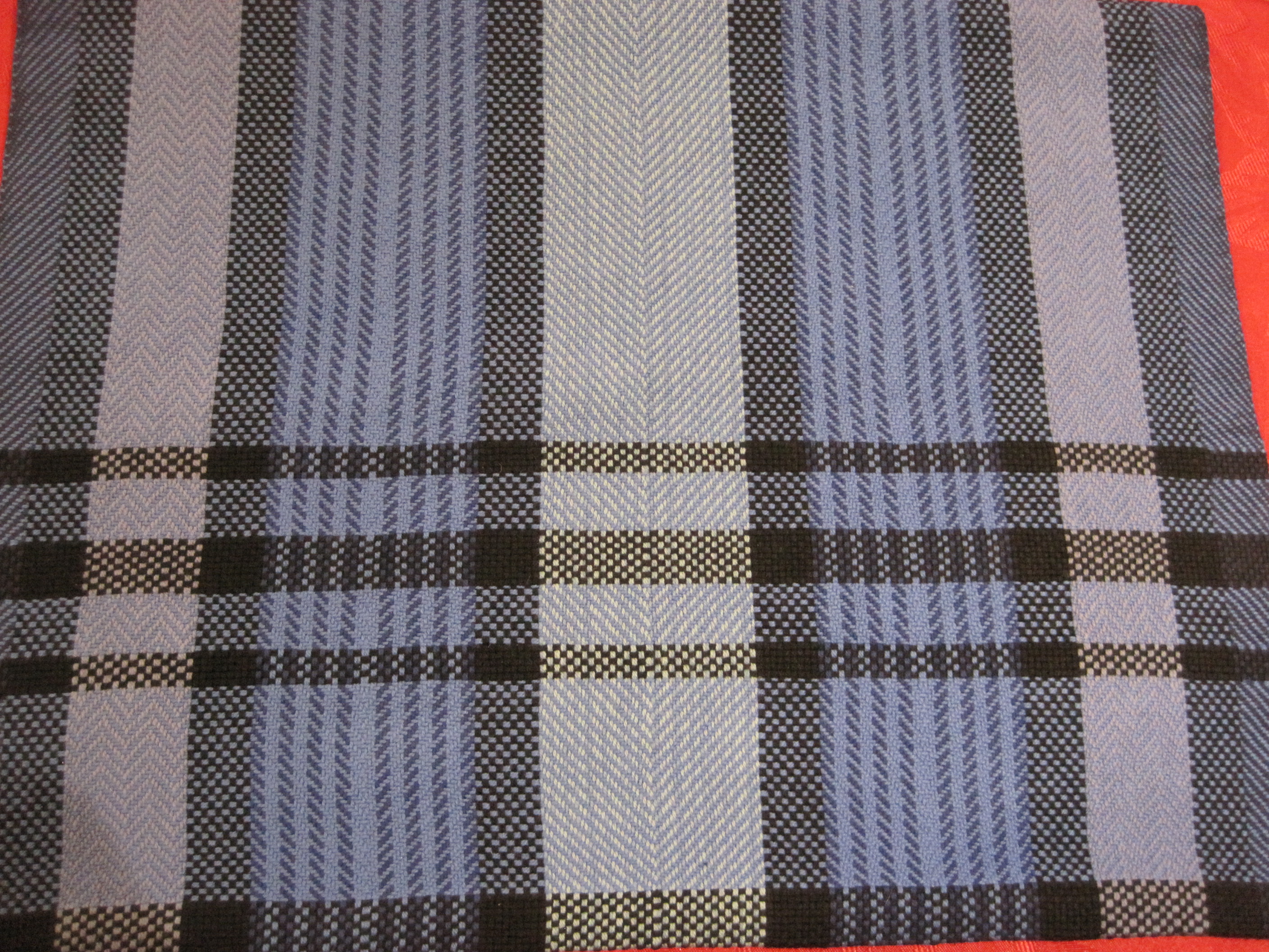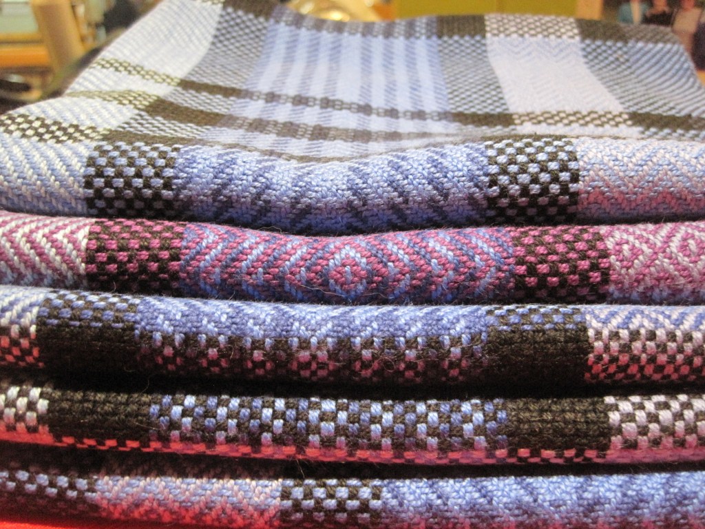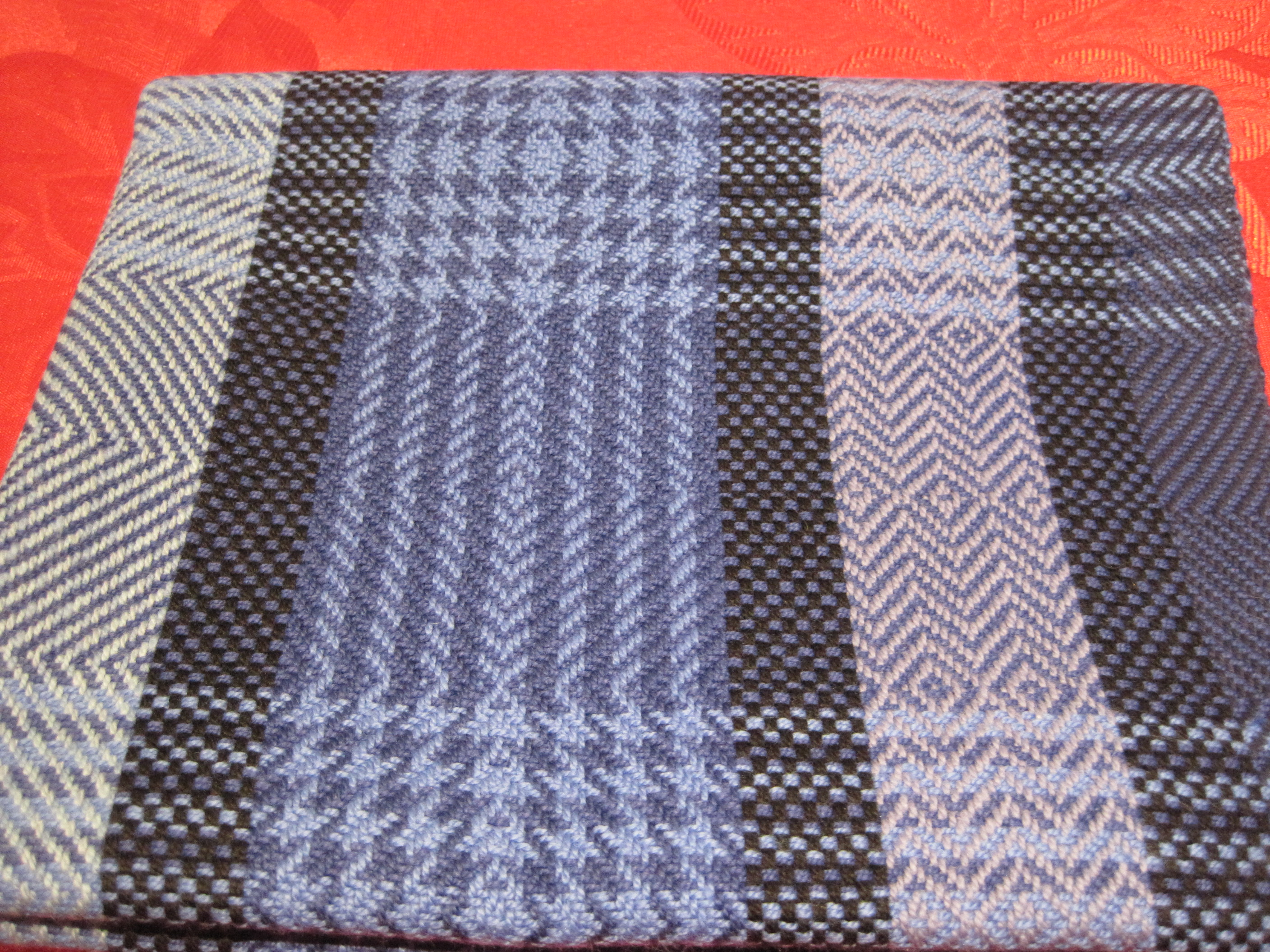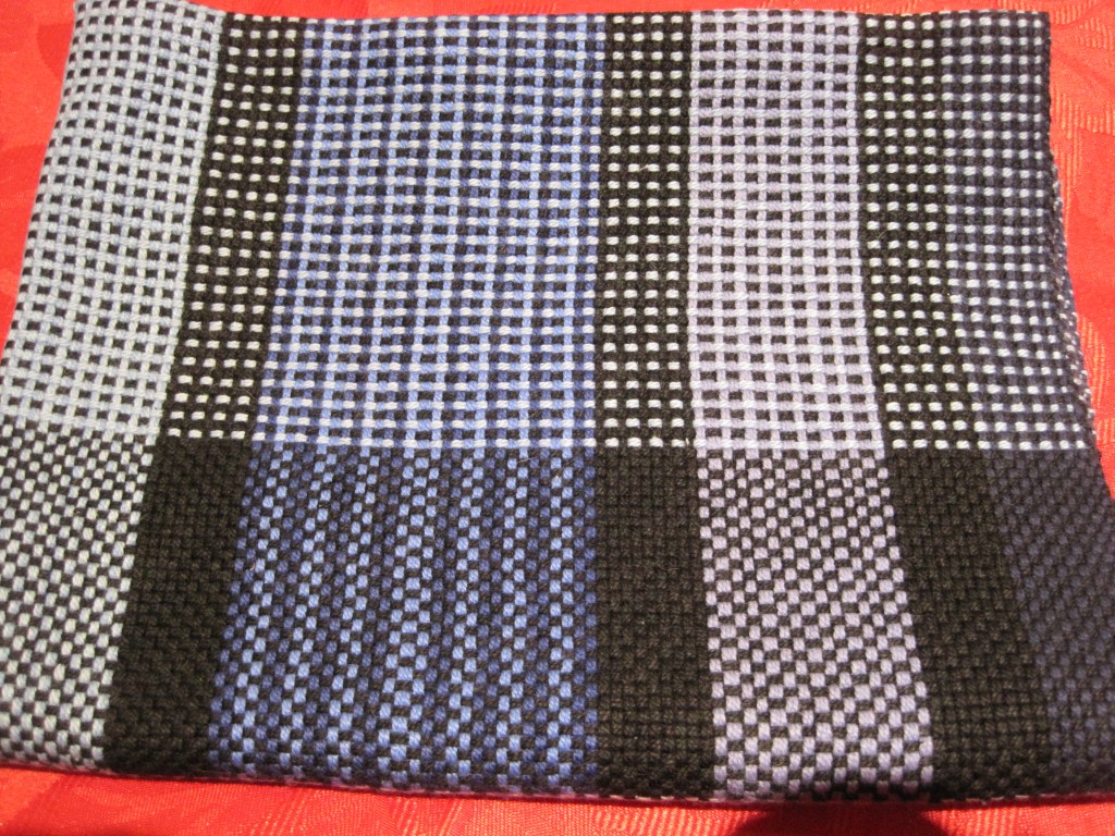 The last one I wove, using the colours and threadings “as-drawn-in”, or “trop as writ”, where the weft colours and twill patterns follow the order of the warp threading.