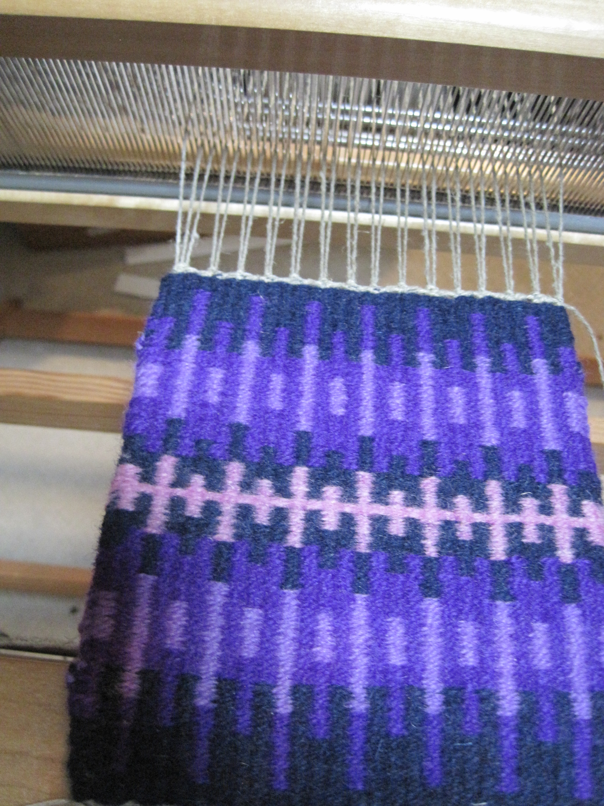 The Ashford table loom hold a carpet warp to weave mug rugs based on the samples in Jane Stafford Online Guild episode 4.9-Weft Faced Twills.  I decided to weave the samples mug rug size to help my materials stretch further.  With only 69 ends and sett at five ends per inch this warp was super fast to get dressed on the loom.  The weaving however is super, super slow.  It took me three full hours to weave one 6-inch-wide, 7-inch-long mug “carpet”.  My daughter suggested that these be called mug carpets instead of mug rugs, because they are very heavy and dense.   Here I get to play with colour and symmetry, and graphic division of space.  A lot of design considerations go into each little carpet.  I expect it will take me a good long while to work through five yards of warp.