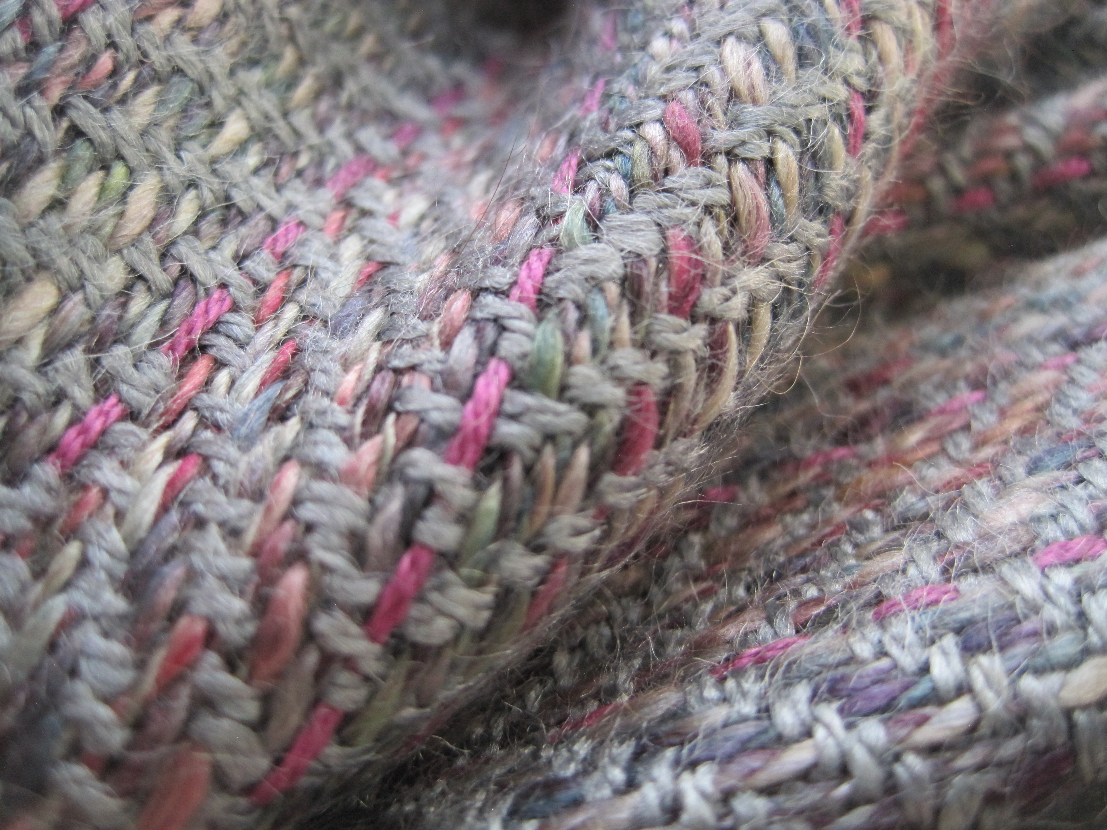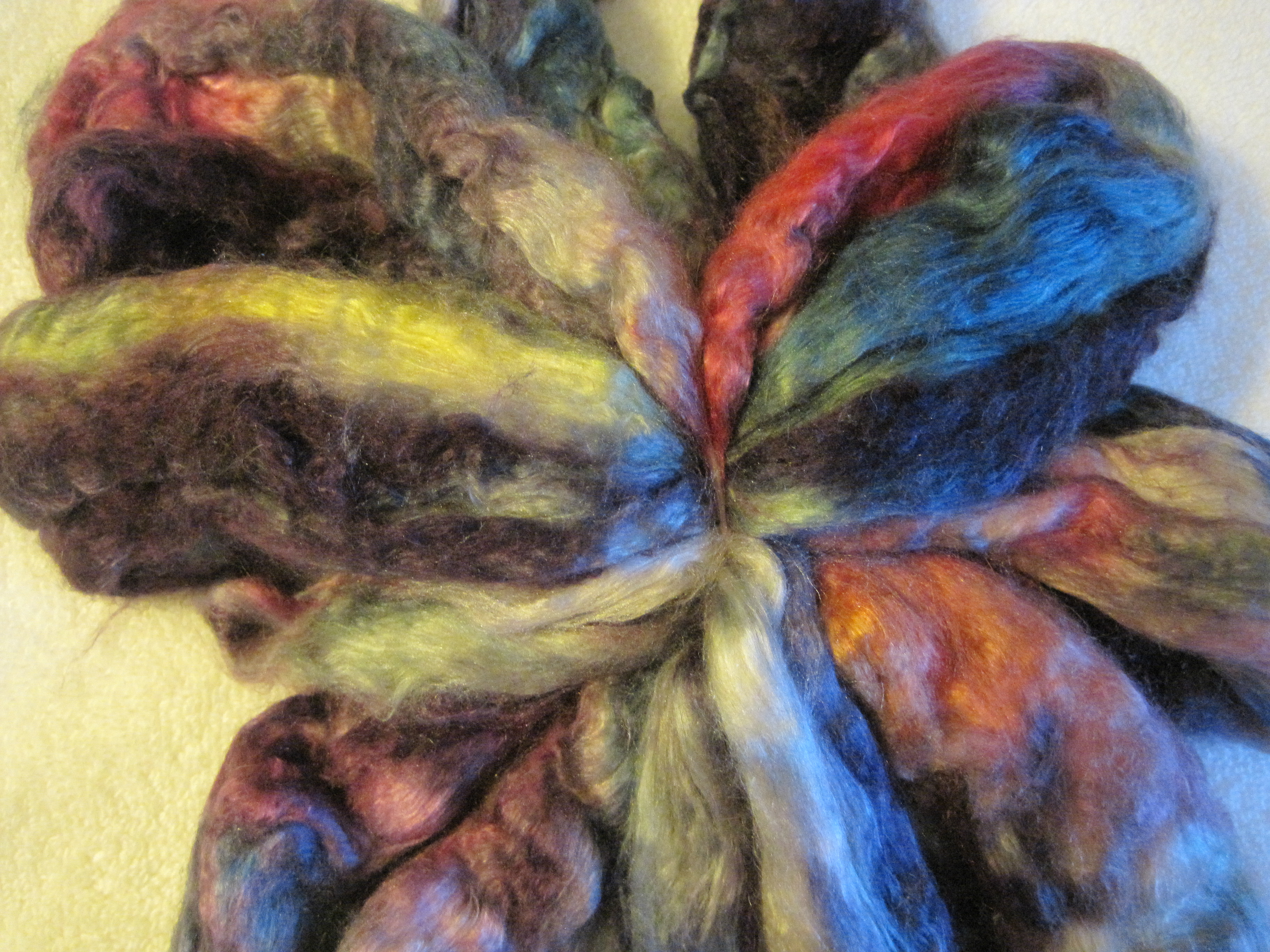I decided to spin this fibre fine, emphasizing the luster of the silk, with a plan to use it for weaving. I got a beautiful random variegated yarn, and made a 2-ply yarn. I used a short forward worsted draft for stability while weaving. The fibres drafted easily creating a slippery, high luster yarn. I continued spinning, moving through colours of fuchsia lipstick to stormy grays. It was so interesting to spin because the colours were constantly changing. The resulting yarn is lace-weight, and I ended up with 493 yards of 2-ply from 113 gms (4 oz) of fibre.