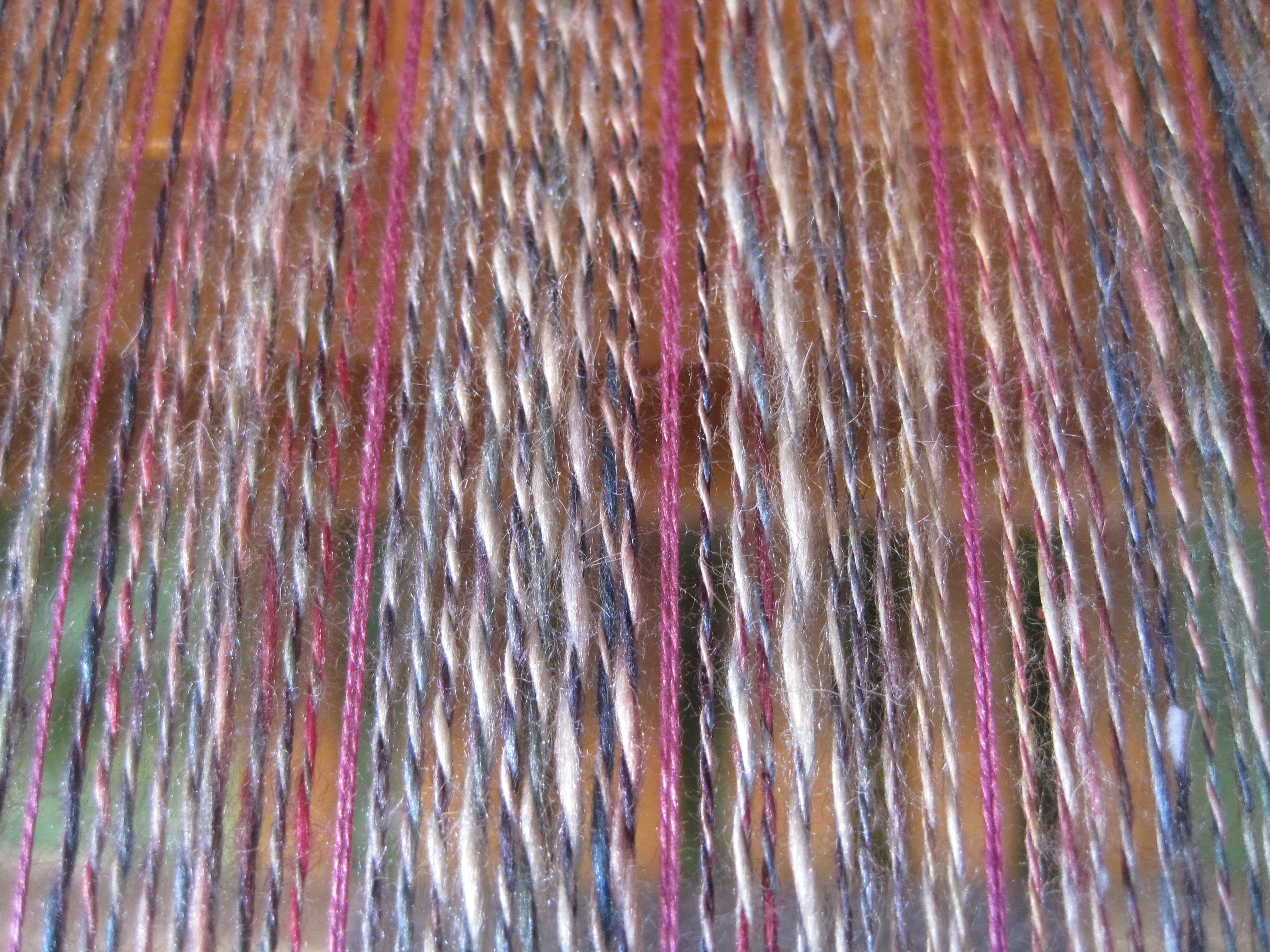And so, on to the weaving. I wanted to use the handspun as warp and I wanted to create two related scarves. I wound a warp 5 yards long, and sett at 15 ends per inch. I was about 10 threads shy of my desired width of 7” for the scarves, so I added 10 doubled ends of 2/20 fuchsia silk spaced out through the warp.