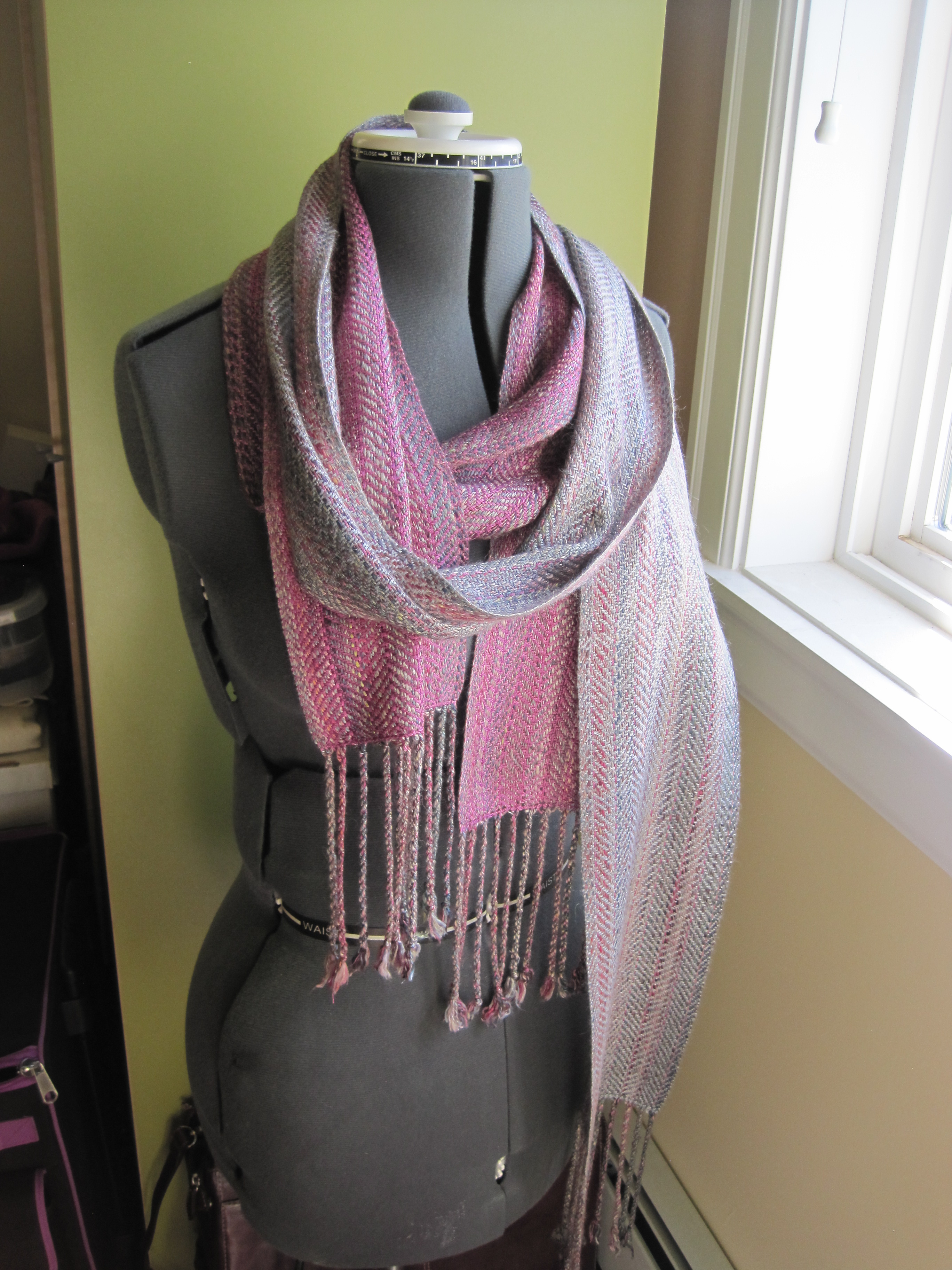 For weft I chose 2/20 silk in pale blue-gray for the first scar and in fuchsia 2/20 silk for the second scarf . Both were woven at 15 picks per inch for a length of 72 inches on the loom, excluding fringes. The ends were twisted and then the scarves were finished with a hand wash in a warm bath with mild agitation to full the yarns, laid flat to dry and ironed while slightly damp with a warm iron set to silk. Two finished scarves, soft to the skin, with good drape and a pleasure to make from start to finish.
